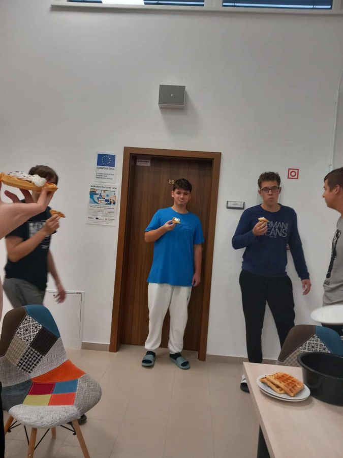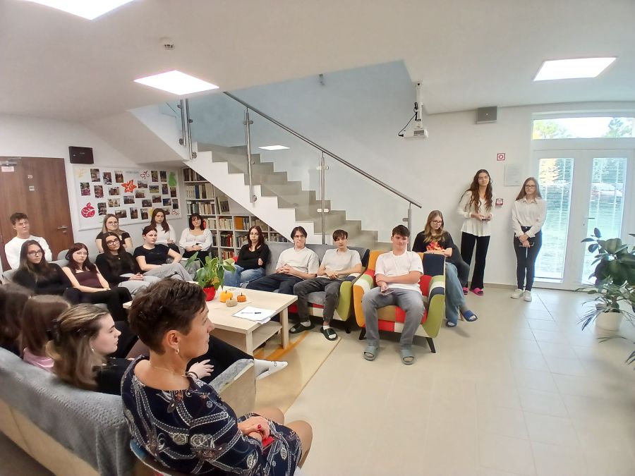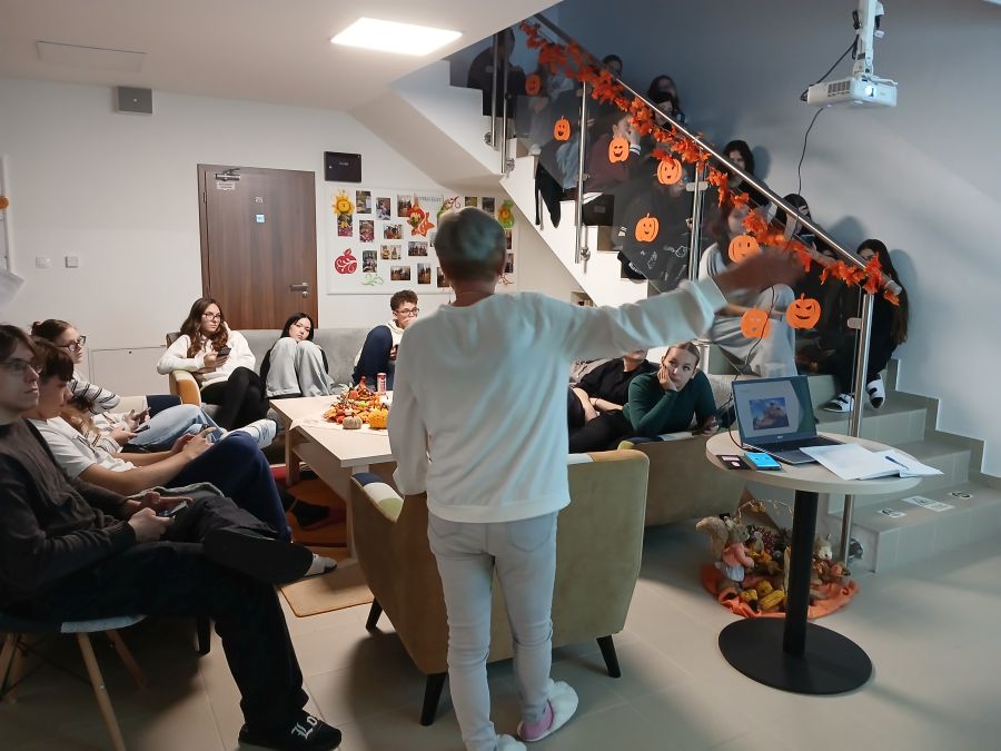 Ako sa letné teplo pomaly zmenilo na jesenný vánok, náš študentský domov opäť ožil. Ožili nielen izby, ale aj chodby, spoločenské miestnosti a malá kuchynka – pretože u nás jeseň nezačína len učením, ale aj zážitkami. Začiatkom septembra sme sa naladili premýšľavými, no zároveň veselými súťažami a hádankami, a potom sme sa v tímoch pustili do mestského hľadania pokladov. Človek by ani nepovedal, koľko tajomstiev môže ukrývať mesto, keď si všímame detaily – a my sme si veru veľmi dobre všímali! Medzitým sa v kuchynke šírili úžasné vône, obľúbené jesenné dobroty sme pripravovali spolu a vymieňali si aj zážitky. Potom prišli prváci – trochu nesmelo, no s veľkou zvedavosťou. A my sme sa postarali o to, aby sa u nás cítili ako doma. Veselé zoznamovanie, hravá iniciácia – a už sme mali pocit, že sú medzi nami odjakživa. Jesenná výzdoba samozrejme nemohla chýbať: vyrezávanie tekvíc, milé figúrky škriatkov, dekorácie z listov a prírodnín – každý prispel niečím vlastným, a tak sa naše spoločné priestory naozaj stali našimi. Dotkli sme sa aj dôležitých tém: navštívili nás hasiči, ktorí nám porozprávali nielen o hasení požiarov, ale aj o zodpovednosti a rýchlom rozhodovaní. Pri inej príležitosti nás navštívil zdravotník, s ktorým sme diskutovali o telesnej a duševnej rovnováhe – bola to užitočná, úprimná a otvorená debata bez tabu. Jedným z najväčších spoločných zážitkov bola jazda mestským vláčikom – prefrčali sme ulicami mesta, smiali sa, fotili, mávali, spievali – spolu, ako jedna komunita. A keď už hovoríme o komunite – jedno popoludnie sme sa stretli vonku pri pravom jesennom táboráku, kde sme si opekali. Za dva mesiace máme za sebou pestré, rušné a zážitkami nabité obdobie. No najkrajšie na tom všetkom je to, že to neboli len programy – boli to spoločne prežité chvíle. A práve z týchto chvíľ sa stanú spomienky, ktoré nám ešte o mnoho rokov vyčaria úsmev na tvári.