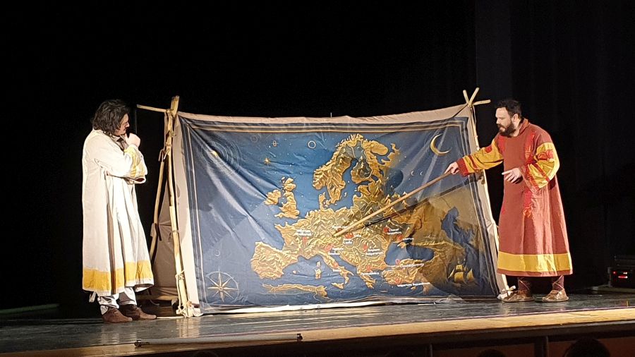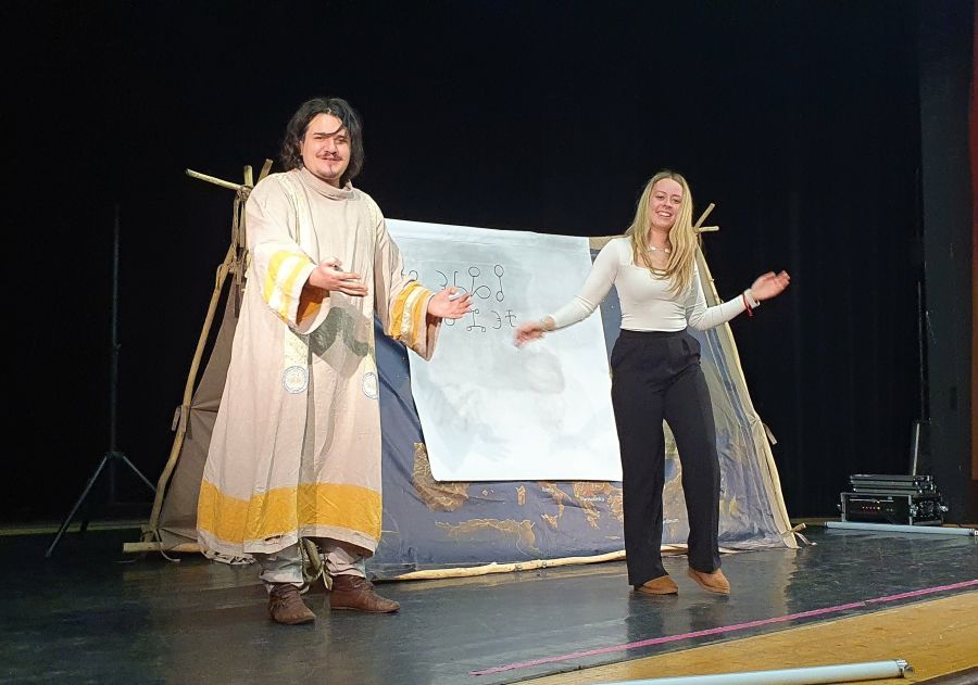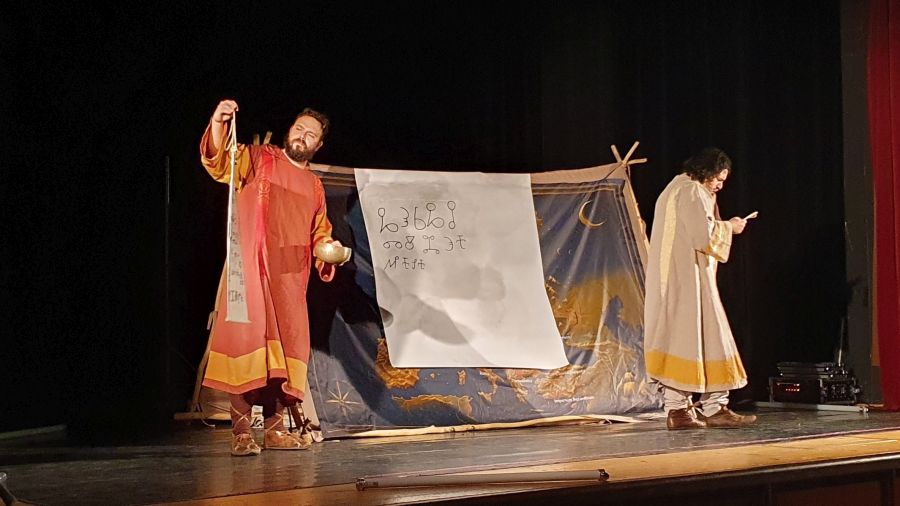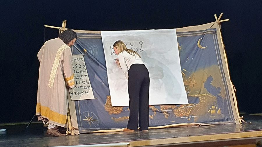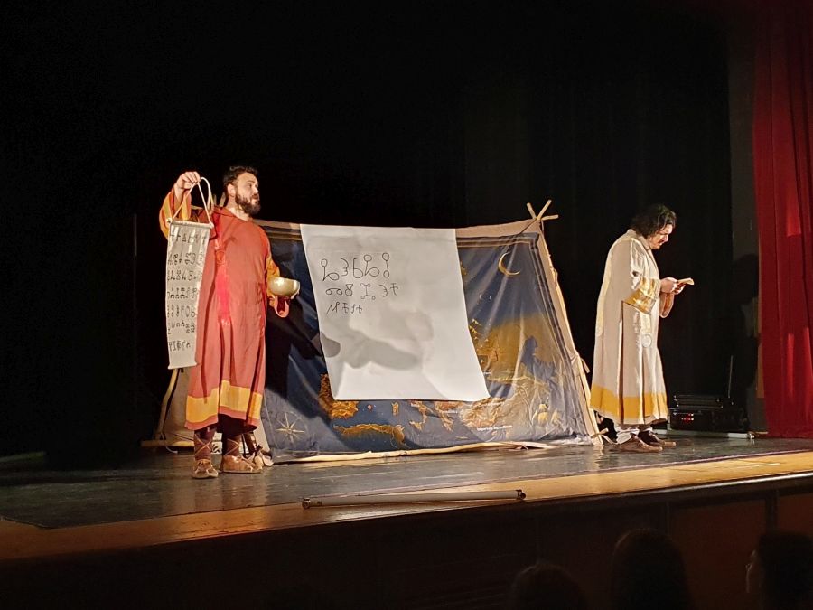 Az előadás interaktív részében a szereplők bemutatták az első írás, a glagolita ábécé keletkezését, amelyet a diákok is kipróbálhattak: leírhatták vele a nevüket. Szó esett a szláv könyvek és az istentiszteletek létrejöttéről is.