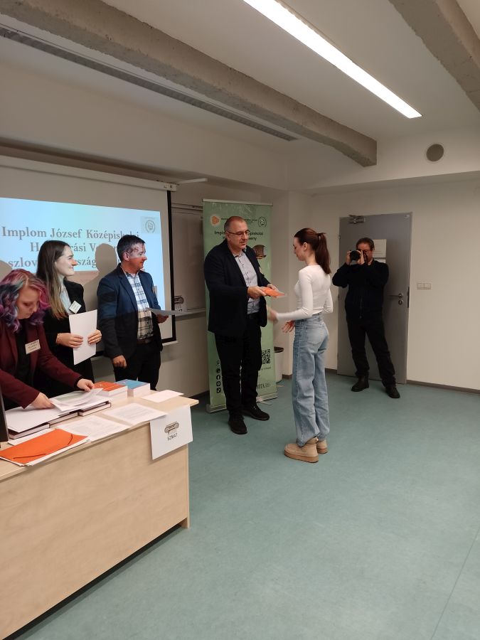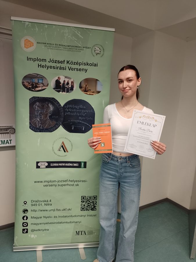 Celoštátne finále Stredoškolskej pravopisnej súťaže Józsefa Imploma v školskom roku 2025/2026 organizovala Fakulta stredoeurópskych štúdií Univerzity Konštantína Filozofa v Nitre. Do súťaže, ktorá sa konala 4. decembra 2025 sa zapojilo 19 študentov z rôznych stredných škôl s vyučovacím jazykom maďarským. Našu školu reprezentovala v súťaži Dóra Rostás, žiačka III. B triedy, ktorá dosiahla v kategórii stredných odborných škôl 3. miesto. Gratulujeme!