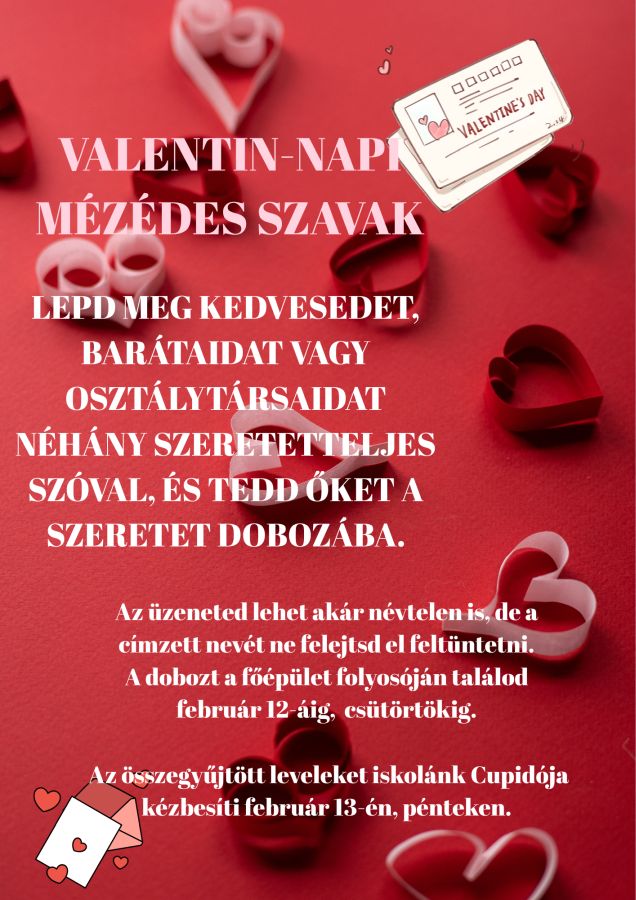 Az iskolákban a diákok mindennapjait sokféle hagyomány és esemény színesíti. Ezúttal Valentin-nap alkalmából lehetőséget kaptak arra, hogy a főépület folyosóján elhelyezett Valentin-napi dobozba rakják kedvesüknek szóló leveleiket vagy kis ajándékaikat. Ezek a szívhez szóló apróságok február 13-án kézbesítésre kerültek a címzett személyeknek. A Valentin-napi dobozba rejtett üzenetek és apró ajándékok kifejezték a szeretet és barátság széles skáláját iskolánk közösségében.