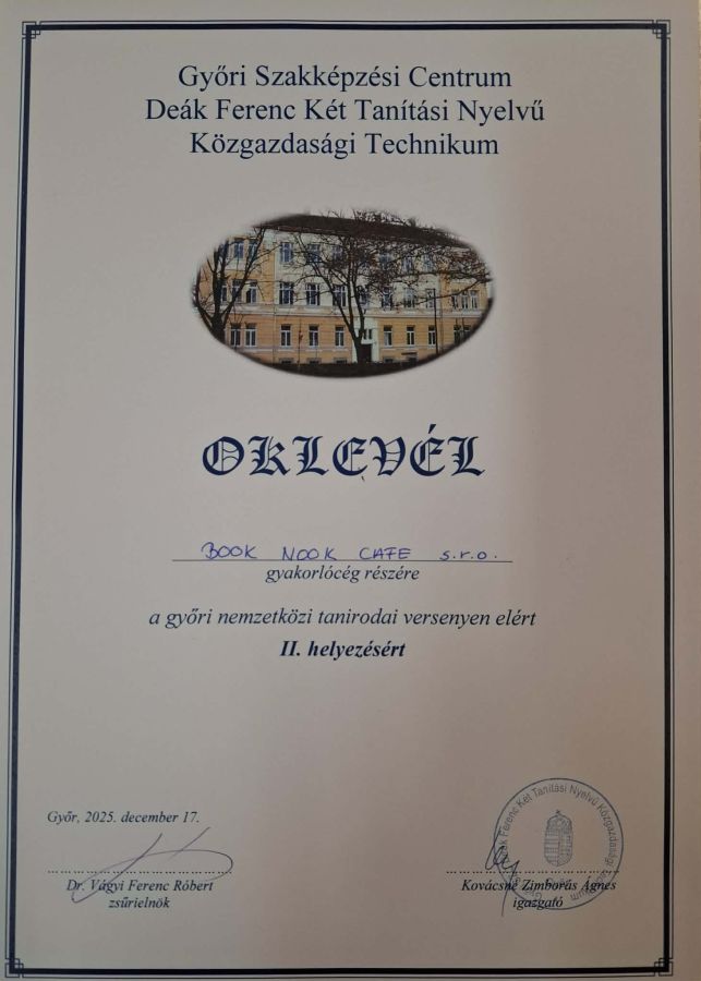Už sa naplno pripravujeme na pokojné vianočné sviatky a zaslúžený oddych, no k záveru roka 2025 bola práca našej školskej komunity zavŕšená mimoriadne radostnou udalosťou. Naša škola, Obchodná akadémia vo Veľkom Mederi, môže byť právom hrdá na svojich žiakov, keďže dňa 17. decembra 2025 reprezentovala našu inštitúciu v Győri na Medzinárodnej súťaži cvičných firiem študentská firma BOOK NOOK CAFÉ. Na tomto prestížnom podujatí sa zúčastnilo celkovo 24 študentských firiem – 12 tímov z Maďarska a 12 zahraničných tímov, ktoré si zmerali svoje vedomosti, kreativitu a odbornú pripravenosť. Počas súťaže boli účastníci oceňovaní v niekoľkých kategóriách, medzi inými za najlepší katalóg, leták, vizitku a prezentačný stánok, ako aj za výkony najšikovnejších obchodníkov a komunikátorov. Na základe celkového bodového hodnotenia boli napokon vyhlásené tretie, druhé a prvé miesto. S osobitnou hrdosťou môžeme konštatovať, že odborná porota udelila cenné 2. miesto našej študentskej firme BOOK NOOK CAFÉ. Toto ocenenie neodráža len vynikajúci výkon na súťaži, ale aj dlhé mesiace vytrvalej práce, spolupráce a zanietenosti žiakov. Za týmto úspechom stojí nadšený a talentovaný tím, na ktorý môžeme byť právom hrdí: Bertalan Bianka, Csíkászová Kamilla, Feketeová Zsófia, Glofáková Viktória, Kristóf Anna, Nagy Nikolett, Nagy Vivien, Némethová Tünde, Olgyay Réka, Sebők Viktória a Sidóová Rebeka, žiačky triedy IV. B.Súťaž navštívili aj žiaci tretieho ročníka našej školy, ktorí so záujmom sledovali celý priebeh podujatia. Ich prítomnosť znamenala nielen povzbudzujúcu podporu pre súťažiacich, ale aj výbornú príležitosť získať skúsenosti, čerpať nápady a zbierať inšpiráciu.Tento spoločný zážitok prispel k tomu, aby sa podnikateľské myslenie študentov prenášalo aj do ďalších rokov. Úspech študentskej firmy BOOK NOOK CAFÉ tak nie je len výsledkom súčasnosti, ale aj základným kameňom sľubnej budúcnosti.